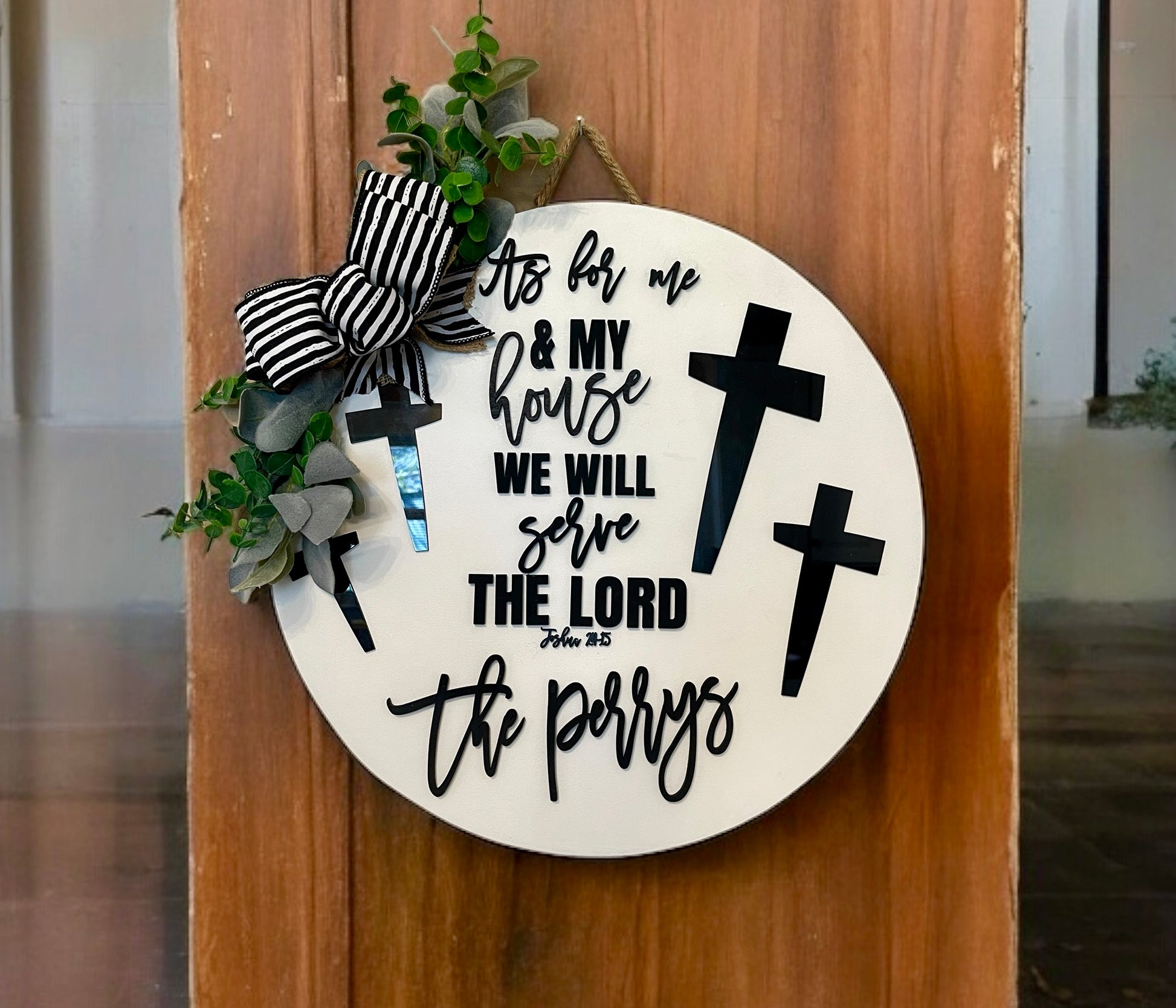 This 18 inch white wood round door hanger features black wood lettering that reads "As For Me and My House We Will Serve the Lord", accented by four black acrylic crosses. Personalize it with your family name for a unique touch. Show your devotion and add a personal touch to your home decor.